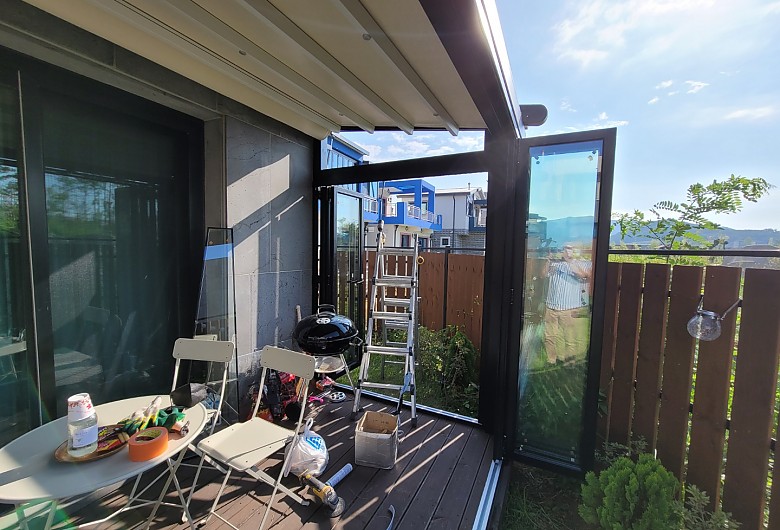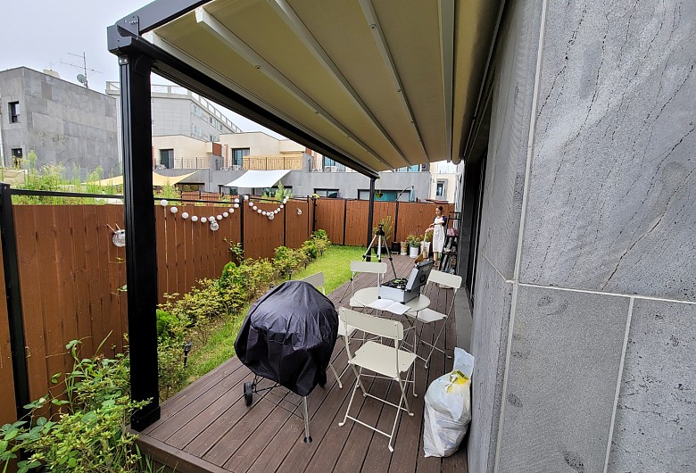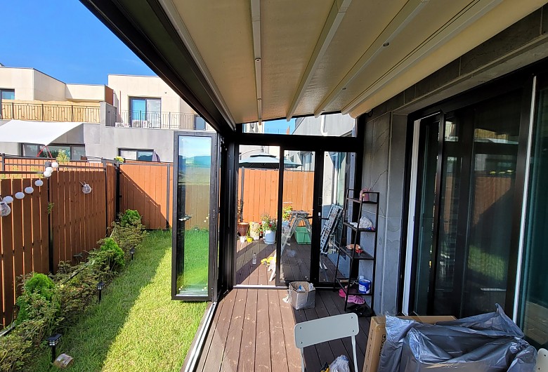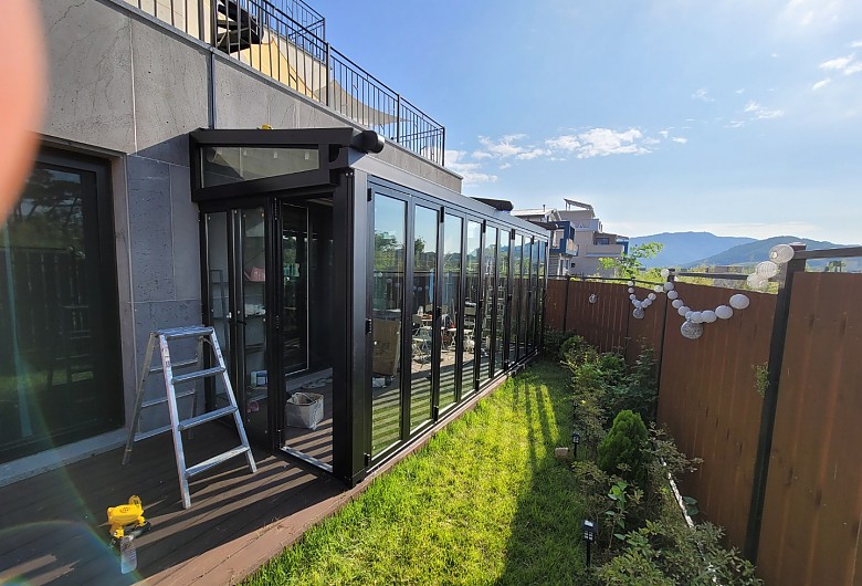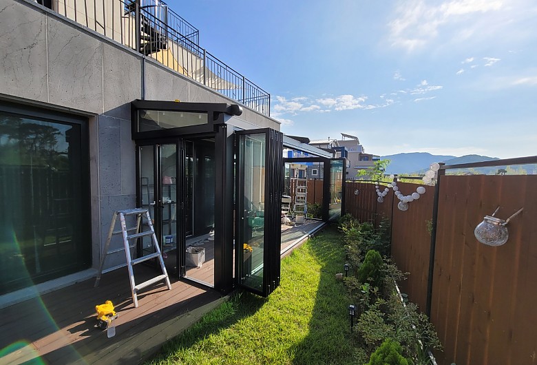 설치된 파고라 하부로 폴딩도어를 설치한 사진입니다.